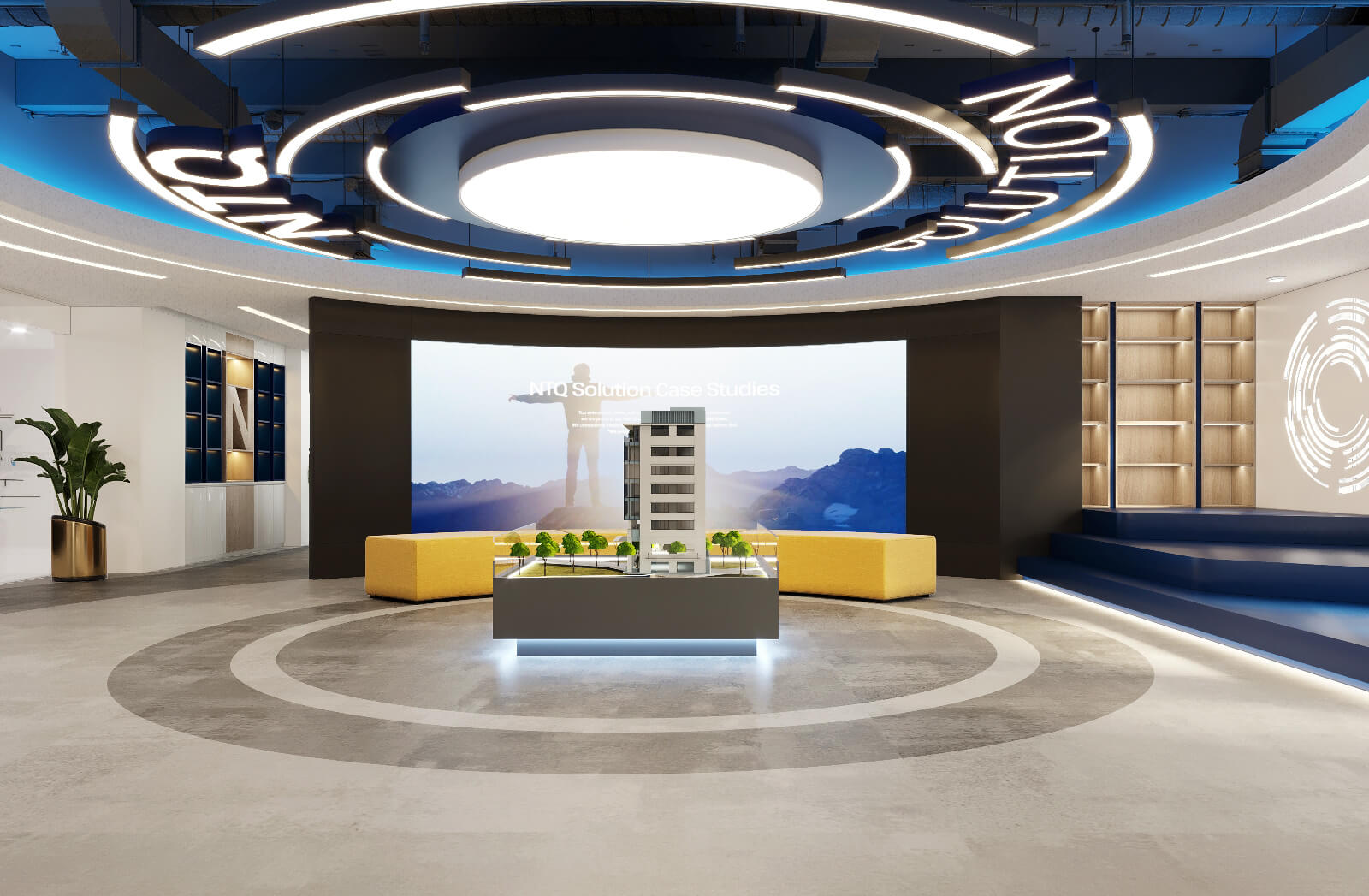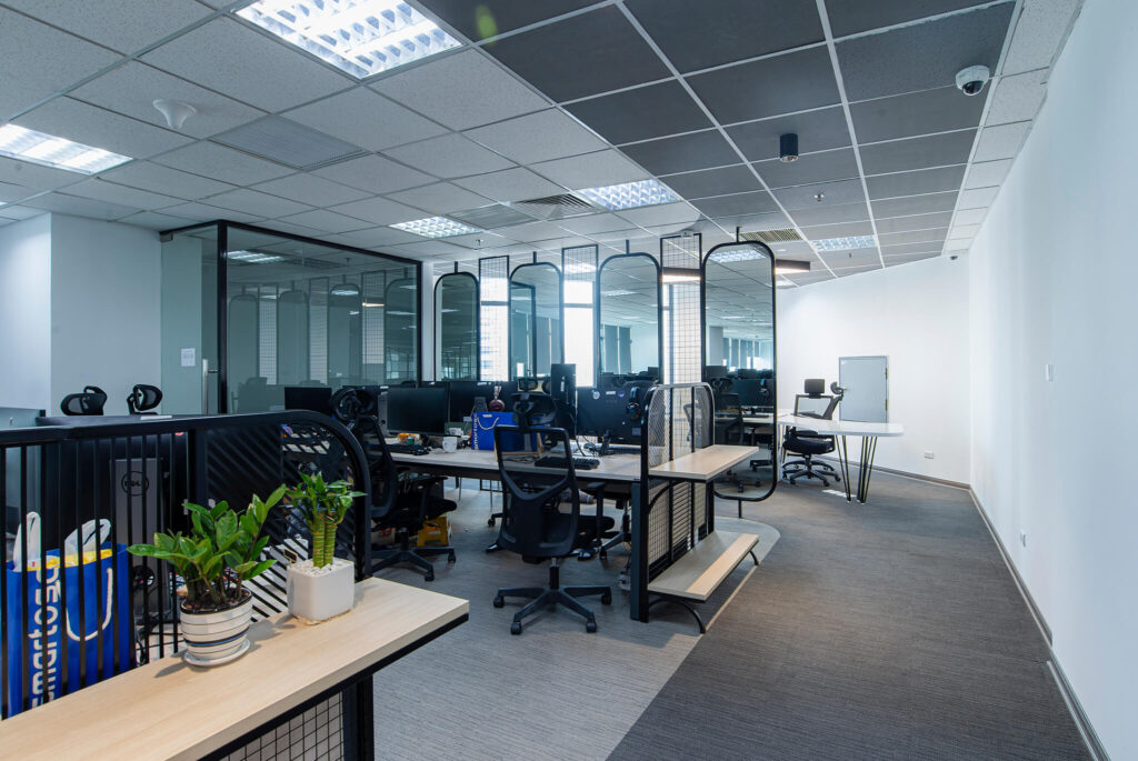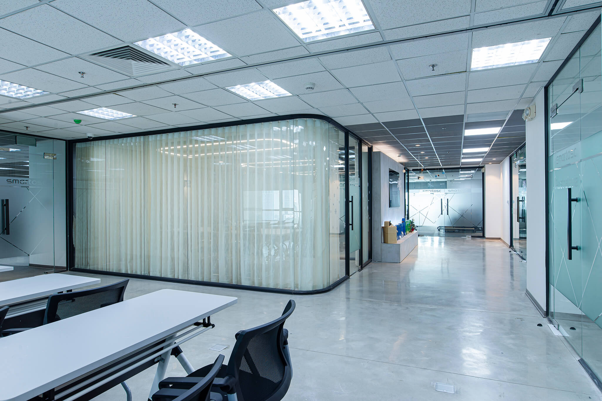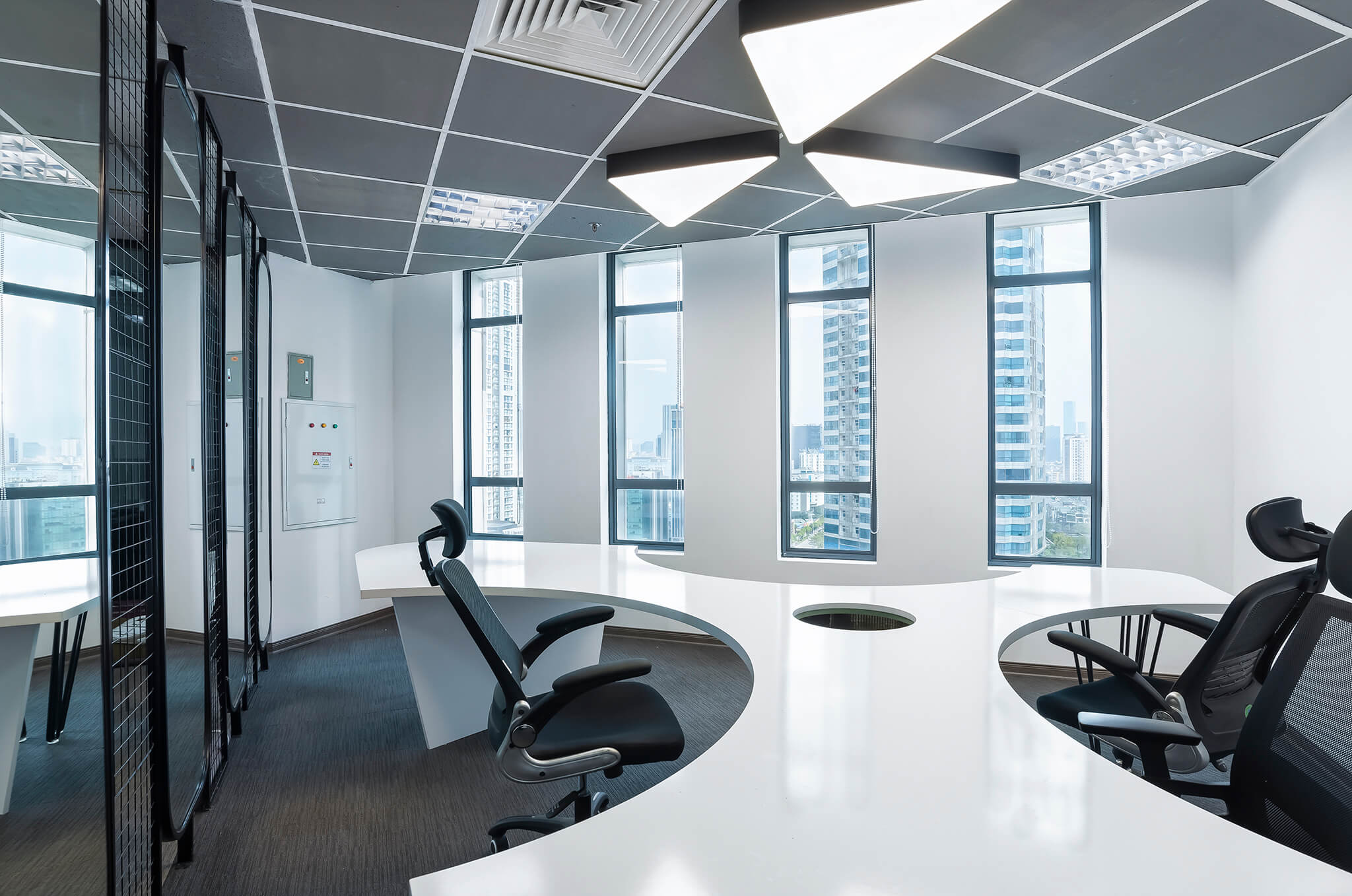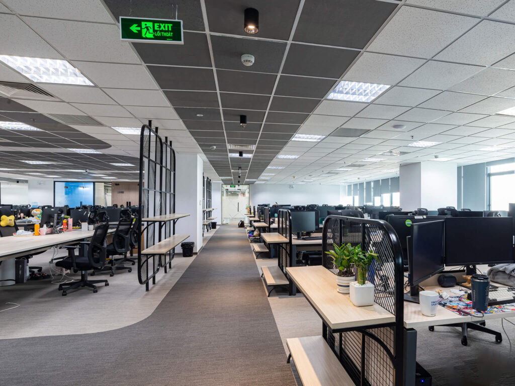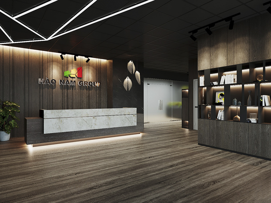 Không gian nội thất văn phòng hiện lên như một “dòng chảy mềm mại” của ánh sáng, đường cong và sắc thái hiện đại. Lối đi uốn lượn dẫn hướng nhìn tiến sâu vào không gian, gợi cảm giác vừa thân thiện vừa đầy khám phá. Hai bên lối đi là những mảng tường cong mềm, kết hợp ghế băng sáng màu và những chậu cây xanh tạo nên nhịp điệu nhẹ nhàng giữa tự nhiên và kiến trúc. Cây xanh xuất hiện đúng chỗ, mang hơi thở trong lành và cảm giác an yên vào không gian làm việc. Bên trong các phòng họp với vách kính trong suốt, ánh sáng tự nhiên chan hòa, phản chiếu lên mặt bàn trắng và những chiếc ghế có thiết kế tối giản. Tổng thể không gian là sự hòa quyện của hiện đại, tối giản và ấm áp – một văn phòng không chỉ để làm việc mà còn để truyền cảm hứng, khơi mở sáng tạo.