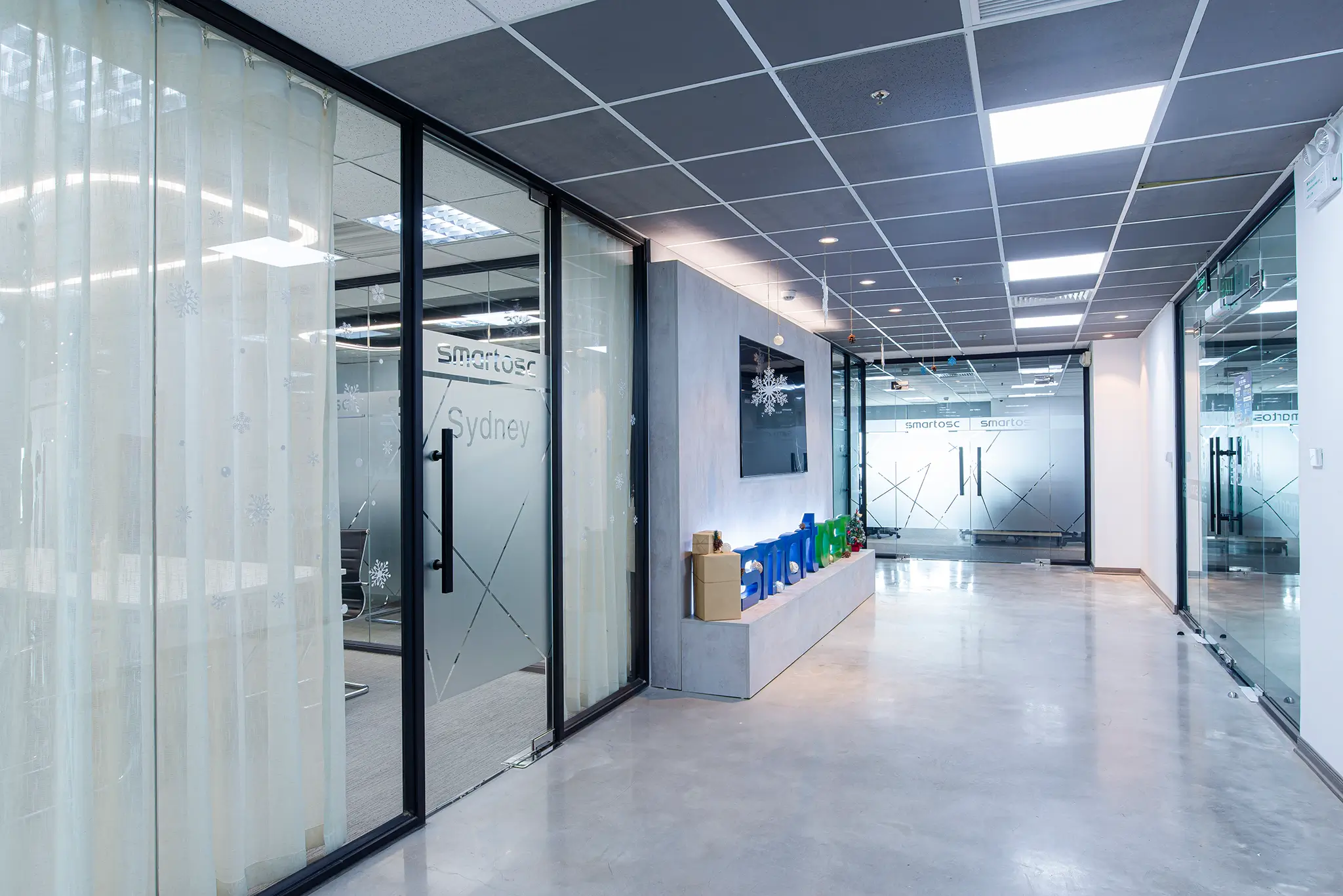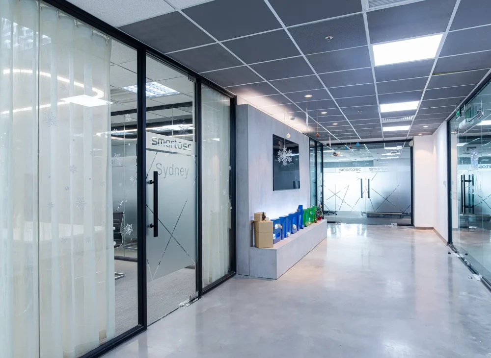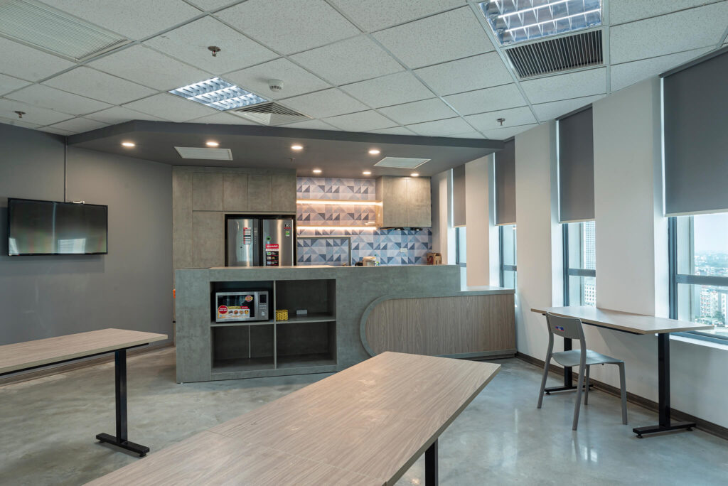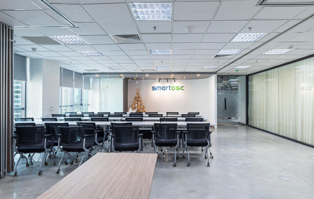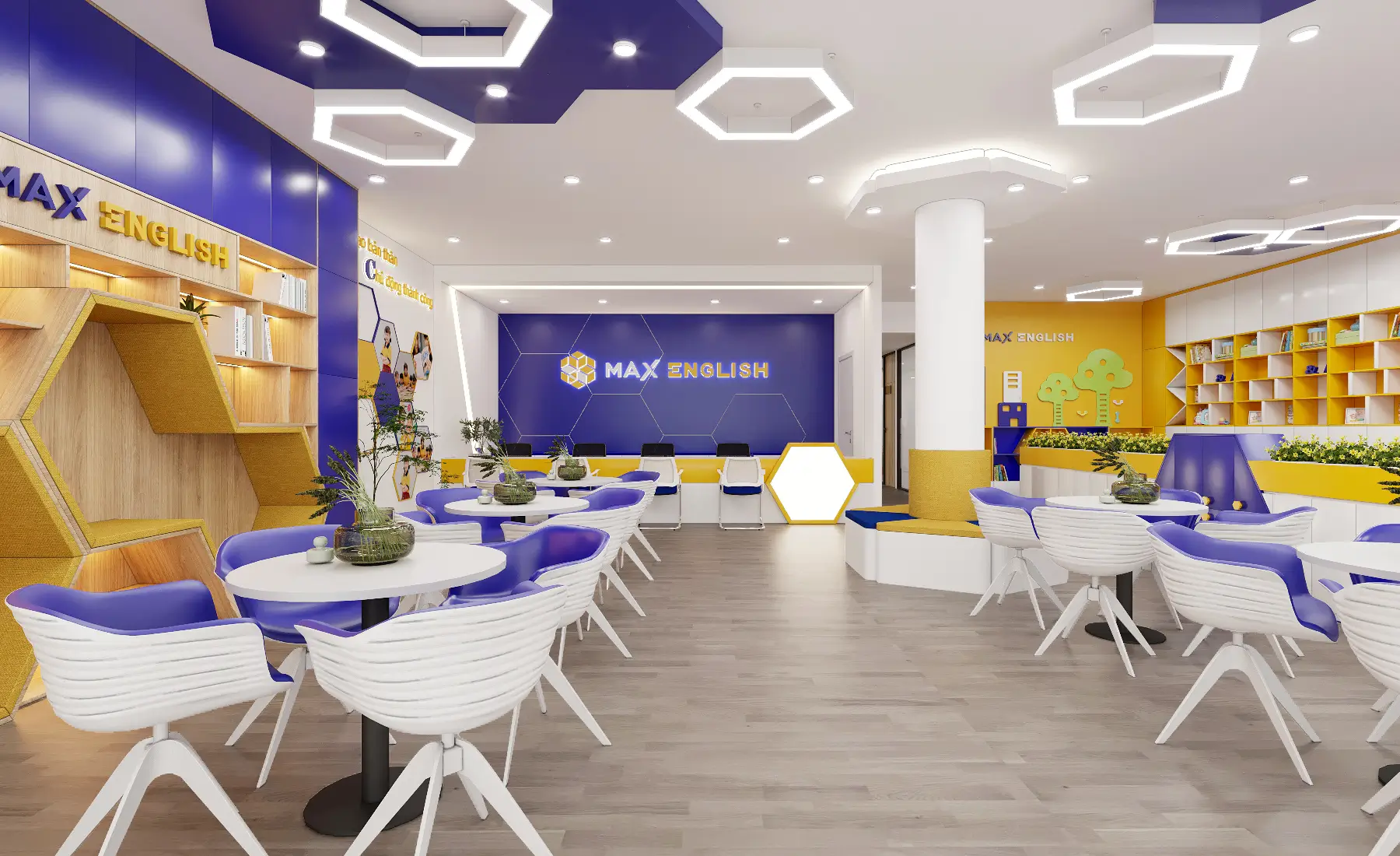 Không gian nội thất văn phòng hiện lên như một “dòng chảy mềm mại” của ánh sáng, đường cong và sắc thái hiện đại. Lối đi uốn lượn dẫn hướng nhìn tiến sâu vào không gian, gợi cảm giác vừa thân thiện vừa đầy khám phá. Hai bên lối đi là những mảng tường cong mềm, kết hợp ghế băng sáng màu và những chậu cây xanh tạo nên nhịp điệu nhẹ nhàng giữa tự nhiên và kiến trúc. Cây xanh xuất hiện đúng chỗ, mang hơi thở trong lành và cảm giác an yên vào không gian làm việc. Bên trong các phòng họp với vách kính trong suốt, ánh sáng tự nhiên chan hòa, phản chiếu lên mặt bàn trắng và những chiếc ghế có thiết kế tối giản. Tổng thể không gian là sự hòa quyện của hiện đại, tối giản và ấm áp – một văn phòng không chỉ để làm việc mà còn để truyền cảm hứng, khơi mở sáng tạo.